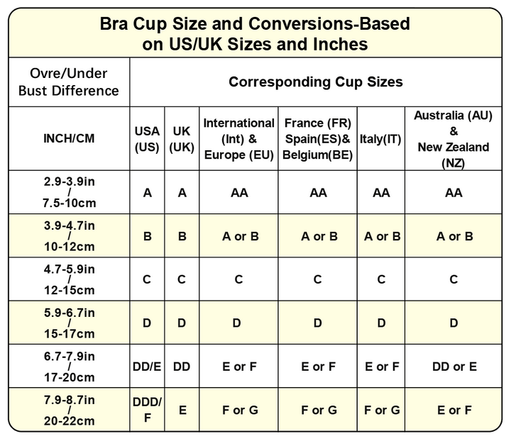 Answer: Step 1,Measure your band size Place the measuring tape around your ribcage, right underneath the band of your bra.Make sure it is pulled tight but is not uncomfortable and that the tape is level.Make a note of how many inches you are.If you land on an even number this is your band size.If you land on an odd number, you’ll want to round up or round down to the nearest even number based on your build. Step 2,Measure your bust size Place the measuring tape around the fullest part of your bust(at nipple level),making sure to hold the measuring tape snugly against you and parallel to the ground. You won’t need to pull the tape particularly tight for this measurement it just needs to sit flat.Make a note of how many inches you are.If it falls on the half-inch, just round up. That’s your bust size! Step 3,Determine Your Cup Size Minus your band size from your cup size and make a note of this value.This difference indicates your cup.Example: 37 inches (bust) – 34 inches (band) = 3 inches. That's a 34C. 0=AA , 1=A, 2=B, 3=C, 4=D, 5=DD(E),6=DDD(F), 7=G