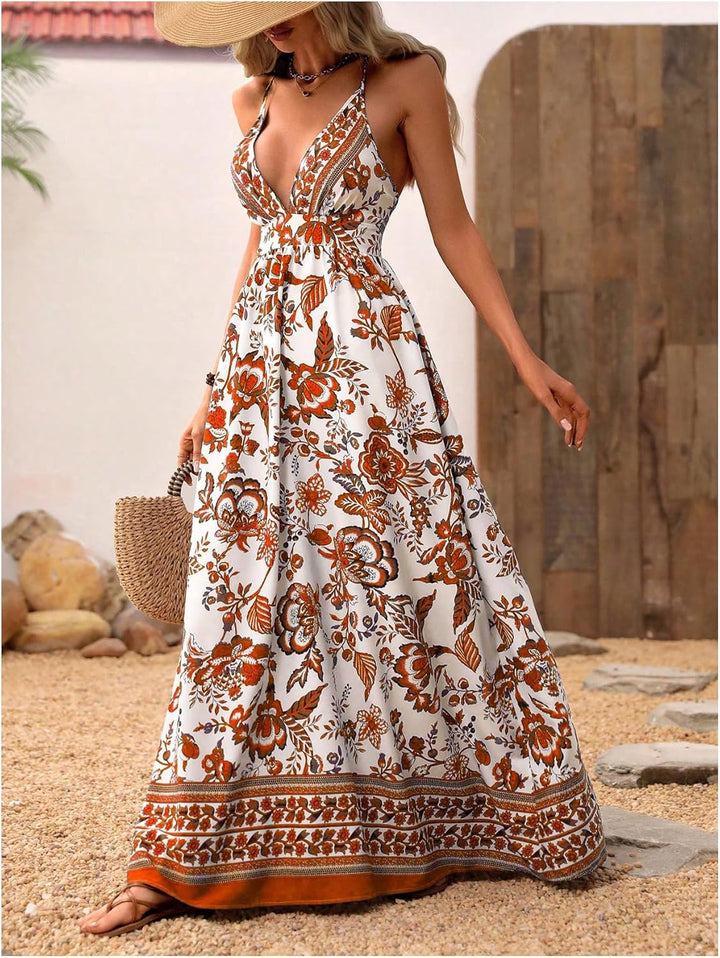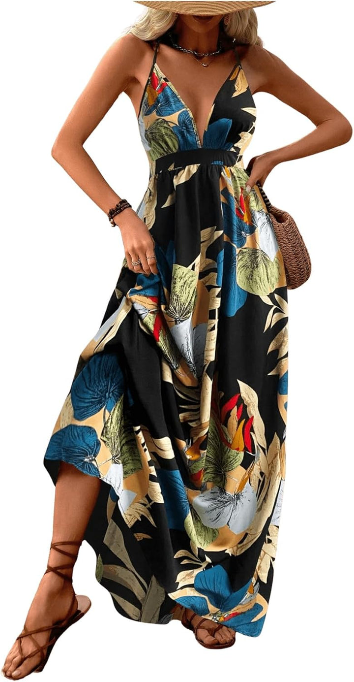 MakeMeChic Women's Boho V Neck Sleeveless Maxi Sundress Floral Print Criss Cross Backless Flare Cami Dress