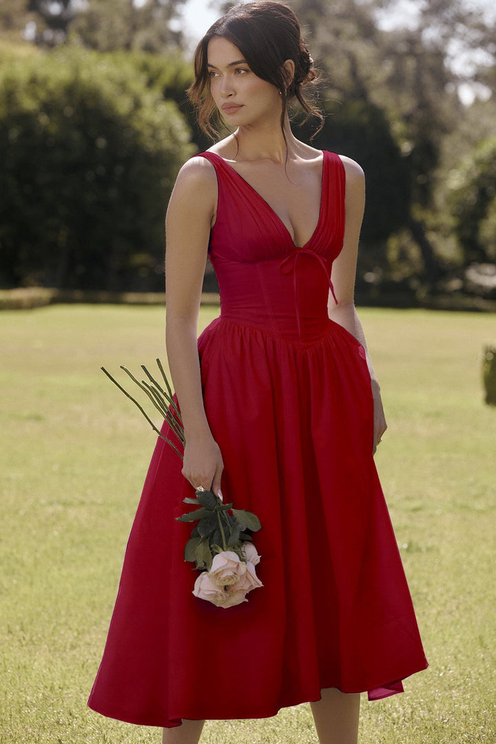 This exquisite dress features a flattering V-neckline that adds a touch of allure to your ensemble.