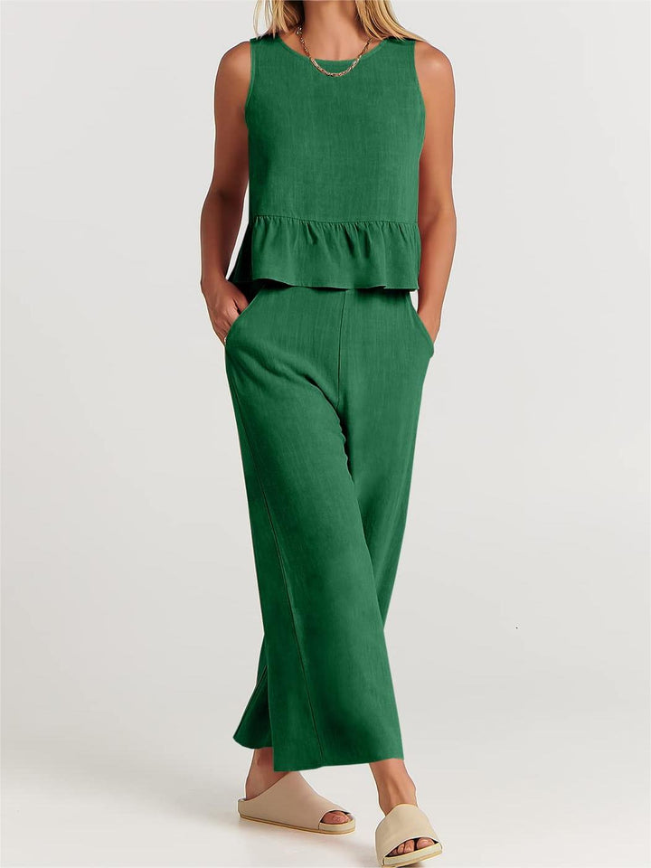 - Features - Cute Summer 2 piece outfits featured sleeveless round neck ruffle hem crop top with button down back, elastic High waist wide leg above ankle length pants with pocket.